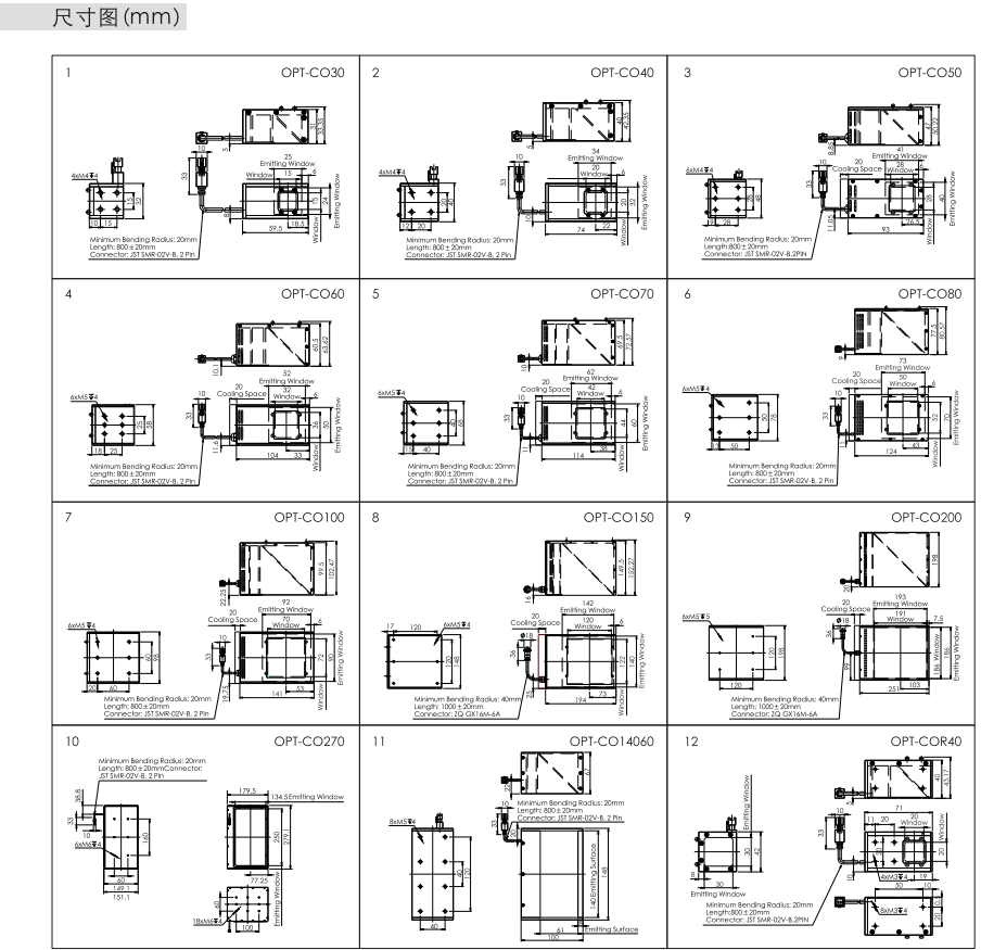 序號 型號 輸出功率○ 輸出功率○○○ 建議配套控制器 1 OPT-CO30 24V/0.4W 24V/1.6W OPT-DPA1024E 2 OPT-CO40 24V/1.3W 24V/2.0W OPT-DPA1024E 3 OPT-CO50 24V/1.1W 24V/5.0W OPT-DPA1024E 4 OPT-CO60 24V/2.5W 24V/8.0W OPT-DPA1024E 5 OPT-CO70 24V/5.5W 24V/12.0W OPT-DPA1024E 6 OPT-CO80 24V/6.0W 24V/13.0W OPT-DPA1024E 7 OPT-CO100 24V/8.5W 24V/15.0W OPT-DPA1024E 8 OPT-CO150 24V/24.0W 24V/43.2W OPT-DPA6024 9 OPT-CO200 24V/48.0W 24V/72.0W OPT-DPA6024 10 OPT-CO270 24V/19.2W 24V/24.0W OPT-DPA1024E 11 OPT-CO14060 24V/5.9W 24V/13.1W OPT-DPA1024E 12 OPT-COR40 24V/2.0W 24V/1.3W OPT-DPA1024E 13 OPT-COR50 24V/2.1W 24V/3.6W OPT-DPA1024E 14 OPT-COR60 24V/3.1W 24V/5.8W OPT-DPA1024E 15 OPT-COR70 24V/3.6W 24V/6.2W OPT-DPA1024E -