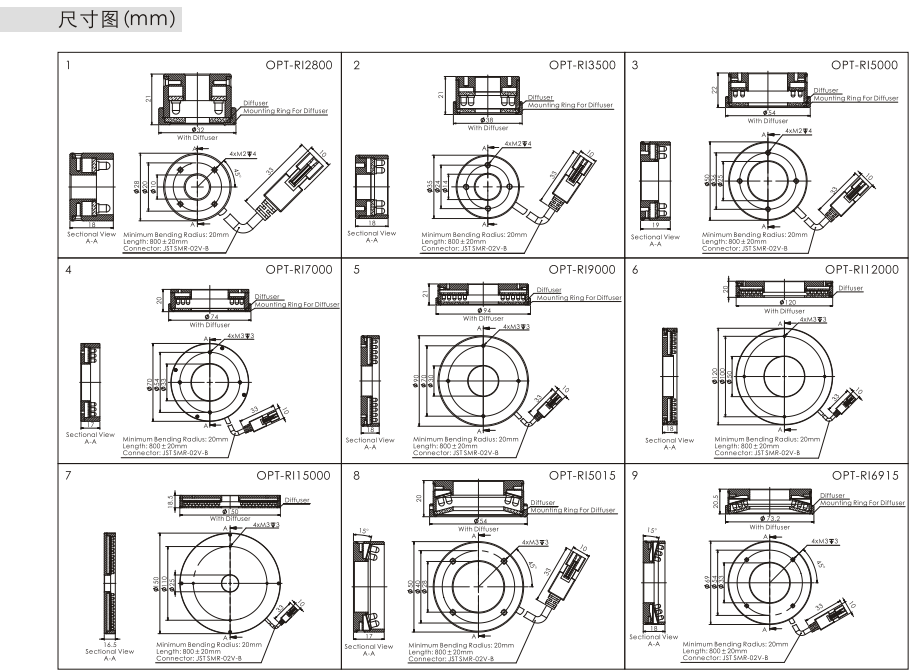 光源選轉軸夾角1 OPT-RI2800 24V/0.2W 24V/0.5W OPT-DPA1024E 0度 2 OPT-RI3500 24V/0.6W 24V/2.9W OPT-DPA1024E 3 OPT-RI5000 24V/0.5W 24V/1.7W OPT-DPA1024E 4 OPT-RI7000 24V/1.2W 24V/2.9W OPT-DPA1024E 5 OPT-RI9000 24V/2.4W 24V/5.6W OPT-DPA1024E 6 OPT-RI12000 24V/3.6W 24V/7.2W OPT-DPA1024E 7 OPT-RI15000 24V/7.0W 24V/16.8W OPT-DPA1024E 8 OPT-RI5015 24V/1.6W 24V/3.0W OPT-DPA1024E 15度 9 OPT-RI6915 24V/2.6W 24V/3.6W OPT-DPA1024E 10 OPT-RI9015 24V/4.0W 24V/6.8W OPT-DPA1024E 11 OPT-RI9215 24V/2.4W 24V/4.9W OPT-DPA1024E 12 OPT-RI10015 24V/5.1W 24V/7.9W OPT-DPA1024E 13 OPT-RI3220 24V/0.6 24V/0.9W OPT-DPA1024E 20度 14 OPT-RI2825 24V/0.5 24V/0.6W OPT-DPA1024E